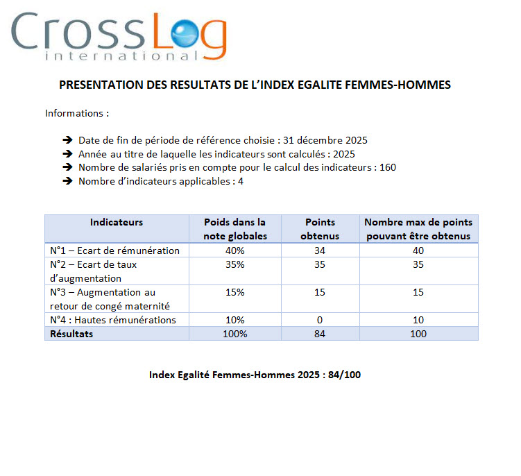 Résultats de l’index égalité Femmes-Hommes 2025 par Céline Rossi | Fév 26, 2026 | Crosslog International | 0 commentaires